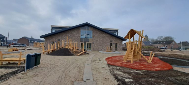 Een prachtig nieuw schoolgebouw met een prachtig schoolterrein in aanleg.
